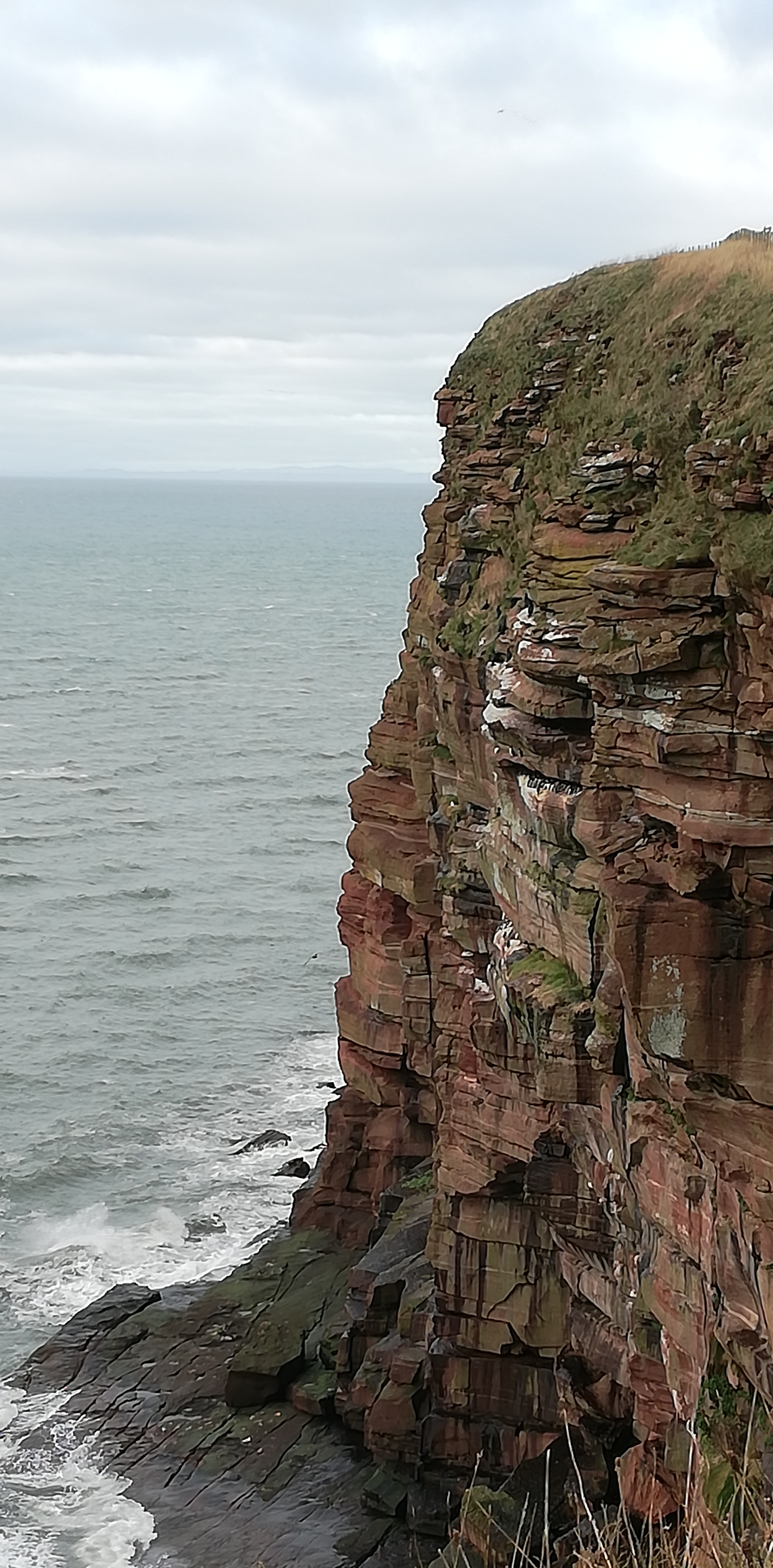 The next morning the sky is cloudy, overcast, with a slight mist in the air. We walk from the beach up the cliff, to the coast path.